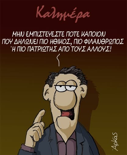Μας ζάλισαν με τη συνέντευξη Σαμαρά. Είπε τούτο είπε εκείνο είπε το άλλο. Λες και διαφέρει από τον σύζυγο της Μαρέβας. Εγώ θα συνεχίσω να γράφω, ότι το μόνο προσόν που εκτιμώ σε έναν πωλητικό είναι το ήθος. Και ο Αντώνης δεν έχει. Δεν θα θυμίσω την πορδυπουργική εντολή στη Δικαιοσύνη «πες στον ψηλό, τον Παναθηναϊκάκια οι επόμενοι τρεις που θα πάνε να τους γ…».