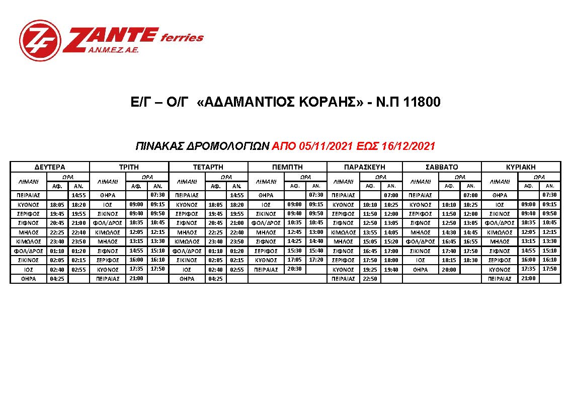 Στον επισυναπτόμενο πίνακα μπορείτε να βρείτε τον πίνακα δρομολογίων του πλοίου της εταιρίας μας Ε/Γ - Ο/Γ "ΑΔΑΜΑΝΤΙΟΣ ΚΟΡΑΗΣ" στη γραμμή των Κυκλάδων απο 05/11/2021 έως 16/12/2021.