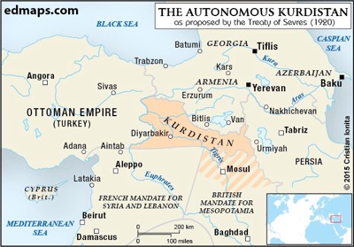 Το 1917 ήταν ένας από τους πολεμικούς σκοπούς του Woodrow Wilson η δημιουργία του Κουρδιστάν, της Αρμενίας και του Ισραήλ. Αφού έστειλε την Επιτροπή King-Craine για να εντοπίσει ακριβώς τους εκεί κατοικούντες πληθυσμούς, διακήρυξε μέσω της υπαγορευθείσης ειρήνης των Sevres (1920) την ανακήρυξη του Κουρδιστάν – που στον διπλανό χάρτη απεικονίζεται με ροζ χρώμα. Η διάσκεψη ενέκρινε επίσης την δυνατότητα της περιοχής που απεικονίζεται με γραμμοσκιές (το σημερινό Ιράκ) να προσχωρήσει μέσω δημοψηφίσματος στο Κουρδιστάν. Παρά ταύτα το κράτος αυτό δεν είδε ποτέ το φως της ημέρας και ακυρώθηκε κατά τη διάσκεψη της Λωζάνης. Μόνο αυτή η περιοχή μπορεί να διεκδικηθεί έννομα από τους Κούρδους.