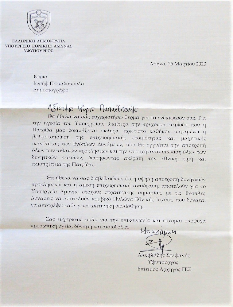 Θα ήθελα να σας ευχαριστήσω θερμά για το ενδιαφέρον σας. Για την ηγεσία του Υπουργείου, ιδιαίτερα την τρέχουσα περίοδο που η Πατρίδα μας δοκιμάζεται σκληρά, πρώτιστο καθήκον παραμένει η βελτιστοποίηση της επιχειρησιακής ετοιμότητας και μαχητικής ικανότητας των Ενόπλων Δυνάμεων, που θα εγγυάται την αποτροπή όλων των πιθανών προκλήσεων και την επιτυχή αντιμετώπιση όλων των δυνητικών απειλών, διατηρώντας ακέραιη την εθνική τιμή και αξιοπρέπεια της Πατρίδας.