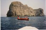 Ελεύθερη κατασκήνωση στο Λιχαδονήσι της βορειοδυτικής Εύβοιας.Μ.Μ. : Αύγουστος ήταν και ξέρω γιατί ρωτάς. Είχε μελτέμια, αλλά μας φύλαγε η Πελοπόνησος. Λίγο πριν το Καψάλι μας βρήκε όμως ένας τοπικός καιρός που μας δυσκόλεψε πολύ μέχρι να μπούμε στο λιμάνι. Είχε κοντό κυματισμό, αλλά πολύ δυνατό αέρα! Μπήκαμε τελικώς στο Καψάλι και ο ξάδελφός μου τηλεφώνησε από ένα μαγαζί στη μάνα του στα Χανιά, η οποία ήταν έτοιμη να πεθάνει από την αγωνία της! Έπρεπε λοιπόν να φύγει το συντομότερο. Εγώ όμως δεν μπορούσα να ταξιδεύσω νύχτα. Στο Καψάλι, εν τω μεταξύ, ήταν αγκυροβολημένο ένα μεγάλο κρούϊζερ του οποίου η προπέλλα είχε μπλέξει στα σχοινιά. Μετά από παράκληση του ιδιοκτήτη του πέσαμε στο νερό και ξεμπερδέψαμε την προπέλλα. Πιάσαμε στη συνέχεια κουβέντα μαζί του και μάθαμε ότι θα έφευγε για τα Χανιά. Έτσι ο ξάδελφός μου έφυγε με το κρούϊζερ, κι' εγώ έμεινα μόνος μου για να συνεχίσω το ταξίδι...