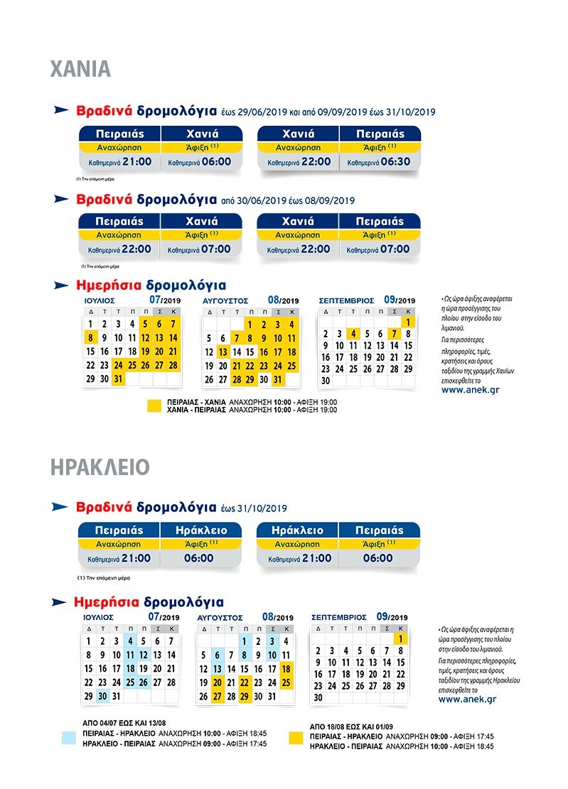 Η ΑΝΕΚ, πέραν των καθημερινών βραδινών αναχωρήσεων, από την Πέμπτη 4 Ιουλίου έως το Σάββατο 7 Σεπτεμβρίου 2019, ενδυναμώνει την γραμμή των Χανίων & του Ηρακλείου με 106 ημερήσια δρομολόγια, σε συγκεκριμένες ημερομηνίες.