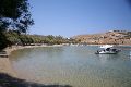 Η Κορρησία, όπως φαινόταν από το σημείο όπου είχαμε παρκάρει. Όταν καταπλέαμε παλαιότερα με το φουσκωτό στην Κέα, είχαμε το δίλημμα πού να δέσουμε. Αφ' ενός μεν για να νοιώθουμε ασφαλείς και να μην έχουμε την ενόχληση του απόνερου ή του αγενούς που θα έδενε πάνω μας και θα περπατούσε με τα παπούτσια του πάνω στα μαξιλάρια των καναπέδων για να βγει στη στεριά, αφ' ετέρου για να είμαστε σχετικώς μακριά αλλά και σε απόσταση βολής από τον "πολιτισμό", που θα μας εξασφάλιζε αυτά που θα χρειαζόμασταν για το ναυτικό camping, το οποίο ούτως ή άλλως ανέκαθεν προτιμούσαμε. Με το αυτοκινούμενο τέτοιες σκέψεις δεν υπάρχουν, καθώς το όχημα αυτό εκφράζει απολύτως το αγαπημένο σλόγκαν των απανταχού της γης κατασκηνωτών "όπου γης και πατρίς"!
