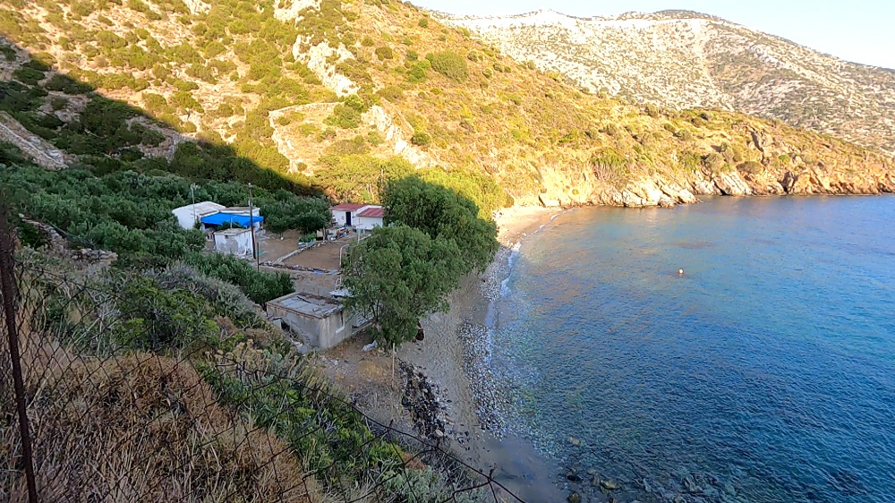 Το προηγούμενο απόγευμα της αναχώρησής μας πήγαμε να συναντήσουμε τους γονείς ενός συνδρομητή μου, του Απόστολου Κυπραίου, μετά από σχετικό μήνυμα που έστειλε στην ηλεκτρονική μου διεύθυνση. Και ενώ συζητούσα με τον πατέρα του Απόστολου, τον Σπύρο, αυτός με ρώτησε αν πήγαμε στην παραλία της Αγίας Τριάδας. "Πού είναι αυτή;" τον ρώτησα. "Α, δεν πήγες στην καλύτερη παραλία του νησιού!", απάντησε εκείνος, και μου εξήγησε πού ακριβώς βρίσκεται. Το πήρα βαρέως. Η ώρα ήταν 7 παρά 5 λεπτά το απόγευμα. Καβάλησα ξαφνικά το παπί και έφυγα, ενώ ο Σπύρος, η γυναίκα του και η καπετάνισσα με κοιτούσαν σαστισμένοι!