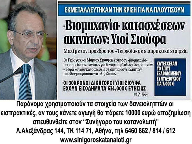 Με την ίδια εταιρεία όµως συνεργάζεται και το δικηγορικό γραφείο του κ. Γιάννη Μούργελα, ο οποίος είναι ο πρόεδρος της «Τειρεσίας Α.Ε.», δηλαδή της εταιρείας που έχουν συστήσει οι τράπεζες προκειµένου να προφυλάσσονται από τους κακοπληρωτές πελάτες τους! Η δικηγορική εταιρεία των νεαρών δικηγόρων και υιών Σιούφα γνώρισε πλήρη άνθηση και τεράστιο τζίρο κατά τη διάρκεια της νεοδηµοκρατικής διακυβέρνησης, εξασφαλίζοντας µεγάλα πακέτα συνεργασίας µε όλες τις τράπεζες.