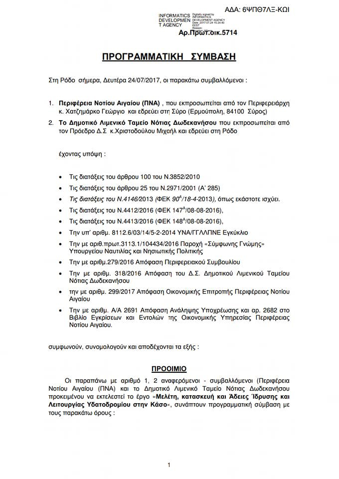 Είναι σε ισχύ δύο Προγραμματικές Συμβάσεις που συνυπογράφονται από τον Περιφερειάρχη Νοτίου Αιγαίου, Γιώργο Χατζημάρκο και την Δήμαρχο Κάσου, Μαρία Τσανάκη και μία τρίτη που έχει υπογραφεί μεταξύ της Περιφέρειας Νοτίου Αιγαίου και του Λιμενικού Ταμείου Ν. Δωδεκανήσου και αφορά την Κάσο. Το τραγελαφικό της υποθέσεως αυτής είναι ότι οι σχετικές Προγραμματικές Συμβάσεις που αφορούν την Κάσο είναι ανηρτημένες στο πρόγραμμα ΔΙΑΥΓΕΙΑ και μπορεί οποιοσδήποτε να τις δει και έτσι να αποδειχθεί το ψευδές των ανωτέρω ισχυρισμών της Δημάρχου Κάσου και του Αντιδημάρχου της. (επισυνάπτονται)